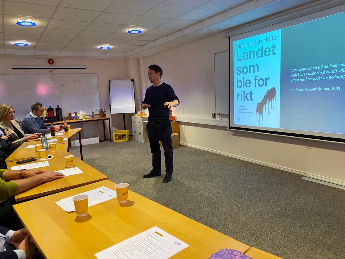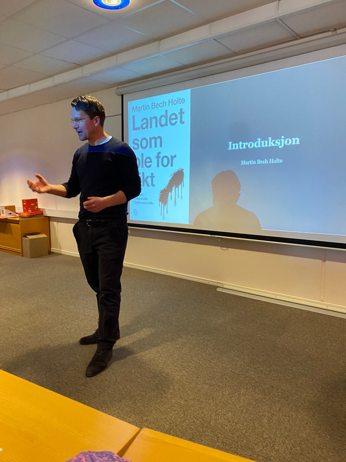 Etter lunsj var det duket for det som var programmets høydepunkt: foredrag med forfatter og økonom Martin Bech Holte, som står bak suksessboka «Landet som ble for rikt». Han leverte absolutt til forventningene da han dro forsamlingen gjennom hovedlinjene fra boka, og sørget for både latter og stummende alvor. Bech Holte avsluttet med å svare på spørsmål og innspill fra en engasjert forsamling.