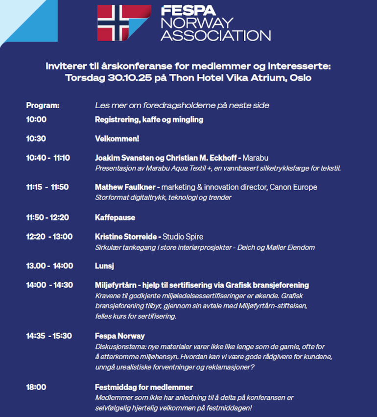 – Årskonferansen er i utgangspunktet et medlemsarrangement, men vi mener at temaene vi tar opp har interesse for flere i grafisk bransje og reklameindustrien. Vi inviterer alle som har interesse av vårt fagområde velkommen til konferansen, sier Per Stene, styreleder i Fespa Norway.