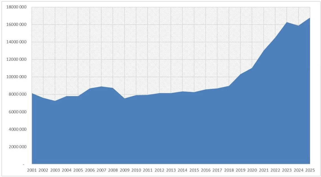 - Likevel, samlet sett økte eksporten av designvarer innen møbler, interiør, sport, tekstil og klær med 5,7 prosent i 2025. Figuren viser samlet utvikling i designeksporten siden 2001. For møbler ble det samlet sett ingen endring i 2025 fra 2024. Fallet i USA er kompensert med vekst i andre markeder.