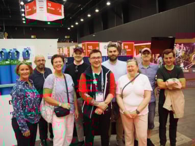 "Industrifolket" i Yrkes-EM 2023. F.v.: Leif Ottar Heimro (ekspert i sveisefaget / Aker Stord), Steffen Skaget (utøver i sveisefaget / Vard Søviknes), Cathrine W. Eidal (MarCom Officer for landslaget i EM / kommunikasjonssjef i Norsk Industri), Eskil Myhre (utøver i mekatronikkfaget / Nammo), Lasse Sætre (utøver i CAD-faget / Nammo / NTNU), Vetle Midteng (utøver i mekatronikkfaget / Hexagon Ragasco / USN) og Kjetil Nilssen (ekspert i mekatronikkfaget / Bilfinger). Foto: WorldSkills Norway