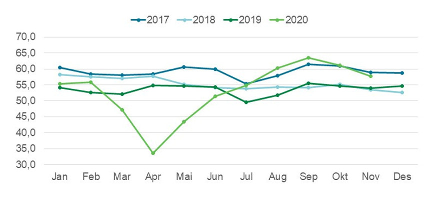 Aktiviteten i kraftforedlende industri tok seg opp mot slutten av året, da flere nye fabrikker ble startet opp. Tall fra kraftforbruket viser en aktivitetsøkning på 5,8 prosent i desember sammenlignet med desember 2019, og en økning på 9 prosent fra aktivitetsbunnen i september til utgangen av året.