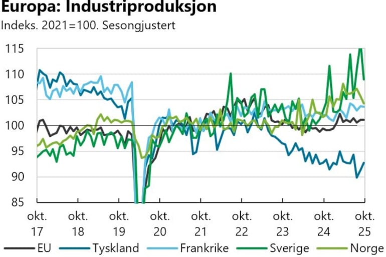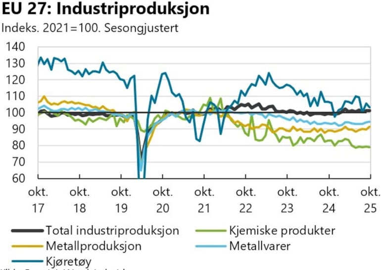 Samlet sett gikk industriproduksjonen i EU så vidt opp de tre første kvartalene av 2025, men i stort har industriproduksjonen i EU hatt en flat utvikling de siste årene. I tysk industri har det vært klar nedgang over mange år, der nivået høsten 2025 var 12 prosent lavere enn i 2017.