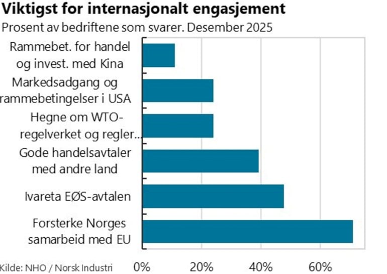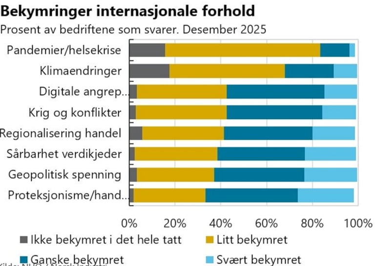 Bevegelse bort fra frihandel til en situasjon der enkeltland og regioner bruker handelstiltak for å beskytte og fremme egen industri er en krevende utvikling for Norge som liten, åpen økonomi og for norske industribedrifter som er avhengig av adgang til eksportmarkeder for utvikling og vekst. Det gjenspeiles i en medlemsundersøkelse utført i januar 2026 om bedriftenes oppfatning av internasjonale forhold. Det industribedriftene oppgir at de er mest bekymret for, er proteksjonisme og handelshindringer, se graf nedenfor. Det er samtidig stor bekymring for geopolitiske spenninger, sårbare verdikjeder, krig og digitale angrep.