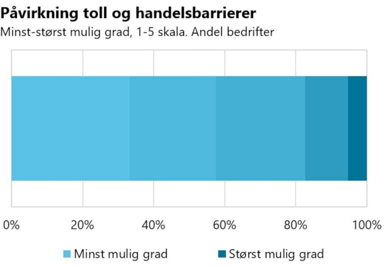 17 prosent av bedriftene, som representerer 22 prosent av antall ansatte i undersøkelsen, oppgir at de i stor eller svært stor grad blir påvirket av toll- og handelsbarrierer. Dette gjelder både gjennom barrierer for eksport av egne varer, kostnadsøkninger for innsatsvarer og virkninger av at kundene blir påvirket av tollbarrierer. Bedriftene som påvirkes omfatter både store selskaper innenfor prosessindustrien, bedrifter innenfor mekanisk produksjon, verksted og service, elektronikk, metallvarer, møbelindustri, tekstil og design. Handelsbarrierene som påvirker dem er både toll på eksport til USA og også EUs beskyttelsestiltak, som påvirker ferrolegeringsindustrien direkte og leverandørene indirekte.