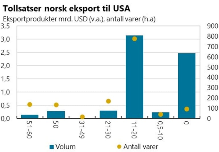 USA er vårt nest største eksportmarked, med om lag 8,5 prosent av fastlandseksporten. Selv om andelen norsk eksport totalt sett til USA er betydelig lavere enn til Europa, kan tollsatsene på eksport til USA ha stor virkning for de sektorene og bedriftene som selger i det amerikanske markedet. Norge eksporterer varer innenfor en rekke industrisektorer til USA, for eksempel metaller, industrimaskiner og møbler. Størst andel varer har vi på den generelle gjengjeldelsestollen på 15 prosent. Stål og aluminiumseksport er nå ilagt 50 prosent toll. Siden varer har ulik tollsats, og i tillegg er ilagt flere typer toll, er det stort spenn i samlede tollsatser på eksport til USA, jf. figur under[1].