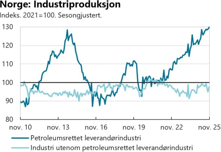 Aktiviteten i petroleumsrettet leverandørindustri har de siste årene økt i takt med økt investeringsnivå på norsk sokkel. Produksjonsnivået i leverandørindustrien mot slutten av 2025 var 30 prosent høyere enn i 2021. Den økte etterspørselen har ført til svært høy kapasitetsutnyttelse i leverandørindustrien, jf. graf innledningsvis.