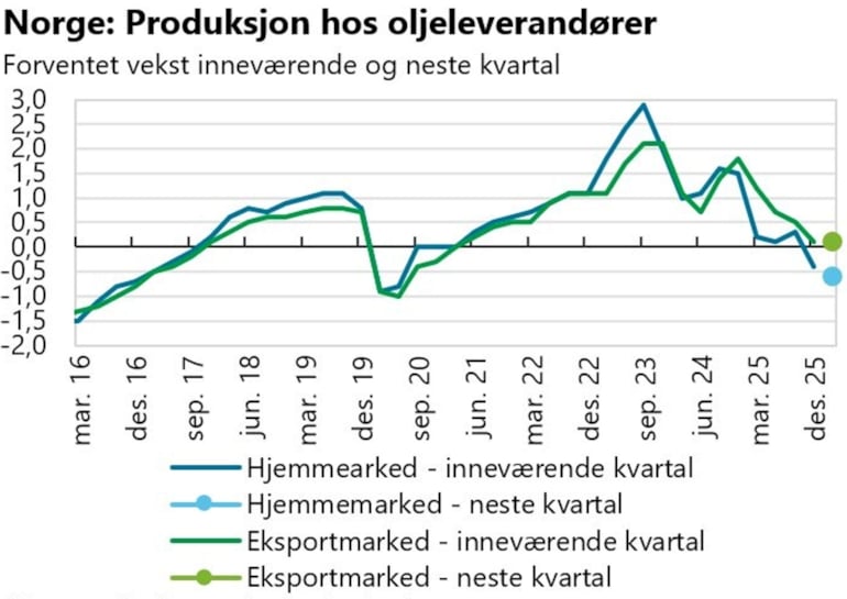 Leverandørene til petroleumssektoren har høy eksport og datterselskaper med omsetning i andre markeder. Ifølge tall fra Multiconsult var omsetningen for leverandørindustrien i 2024 341 milliarder kroner nasjonalt og 111 milliarder kroner i eksport. Utviklingen i internasjonale markeder påvirker derfor også norsk leverandørindustri. Globalt vil oppstrøms investeringer i olje og gass falle med anslagsvis fire prosent i 2026 som følge av lavere olje- og gassprisforventninger og lavere aktivitet i mer prissensitiv ukonvensjonell oljeproduksjon i USA*. Vi ser av Regionalt Nettverk at forventningene til aktivitetsnivå hos eksportrettede oljeleverandører også har blitt redusert gjennom 2025, men mens det forventes at aktiviteten i hjemmemarkedet reduseres, er forventningene så vidt positiv vekst i eksportmarkedet.