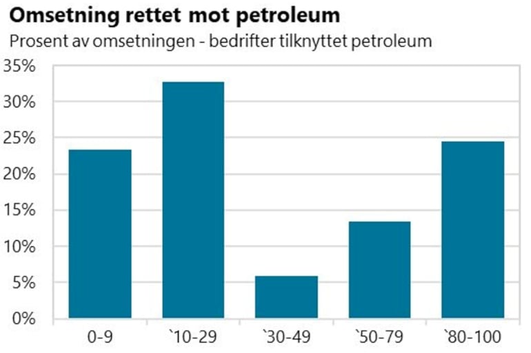 Nedgangen i offshoresektoren vil treffe disse bedriftene ulikt. Over halvparten av bedriftene som rapporterer om leveranser til offshoresektoren har 30 prosent eller mindre av omsetningen i leverandørkjeden, mens en fjerdedel har mesteparten eller all omsetning inn mot denne næringen.