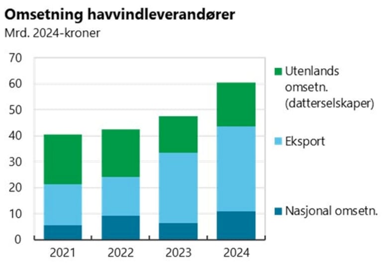 Norsk leverandørindustri til havvindsektoren har de siste årene tatt viktige posisjoner internasjonalt, og eksporten har økt. Globalt er havvind en voksende sektor, og veksttakten vil ifølge prognosene til det internasjonale energibyrået IEA øke videre mot 2030, selv om forventningene er redusert på grunn av endret politikk for fornybar energi i USA og utsettelser i Europa og Japan på grunn av kostnadsøkninger[3]. Eksportøkningene fra norsk leverandørindustri er både innenfor HVDC-plattformer, kabler, maritime tjenester og spesialiserte fartøy og kabellegging[4]. Om lag 50 prosent av omsetningen er innenfor maritim sektor, i produksjon av havvindteknologi-skip og i transport- og installasjonstjenester. Totalt var omsetningen i 2024 om lag 60 milliarder kroner, inkludert omsetning i datterselskaper utenlands, en økning på 21 prosent fra 2023. Utviklingen i 2025 og inngåtte ordre for 2026 tilsier en marginal vekst fra 2024-nivået.