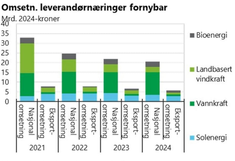 Den samlede omsetningen i leverandørnæringene for fornybar energiproduksjon på land har gått ned de siste årene. Aktivitetsnivået i 2021 var høyt for landbasert vindkraft som følge av tidsfrist for å delta i el-sertifikatsystemet, deretter fulgt av en periode uten konsesjonsbehandling av vindkraftsaker. Eksportomsetningen hos leverandørene for både landbasert vind og vannkraft har også gått noe ned. Eksportandelen samlet innenfor de ulike sektorene er om lag 20 prosent.